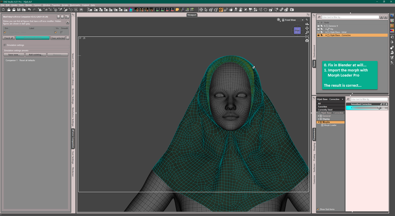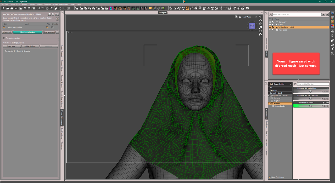 You've not got the point yet... You 'Figure asset of Hijab saved with a dForced sim. result' won't work on any G9 base or character when you go for fixing morph with external application and import back as a delta morphs.