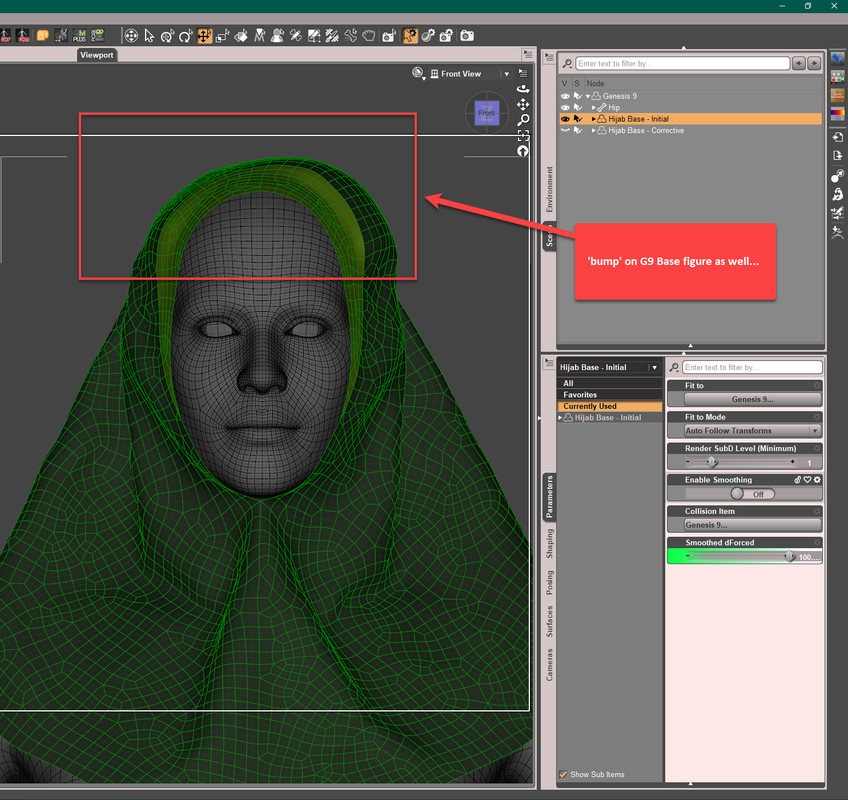 Then, delete the hijab from the scene. Select the figure. Load in a fresh hijab. Your morph should be looking as desired on the figure. Dial the shape out/in on the figure, then select the Hijab and the new morph should be there {toggle show hidden on of course}.