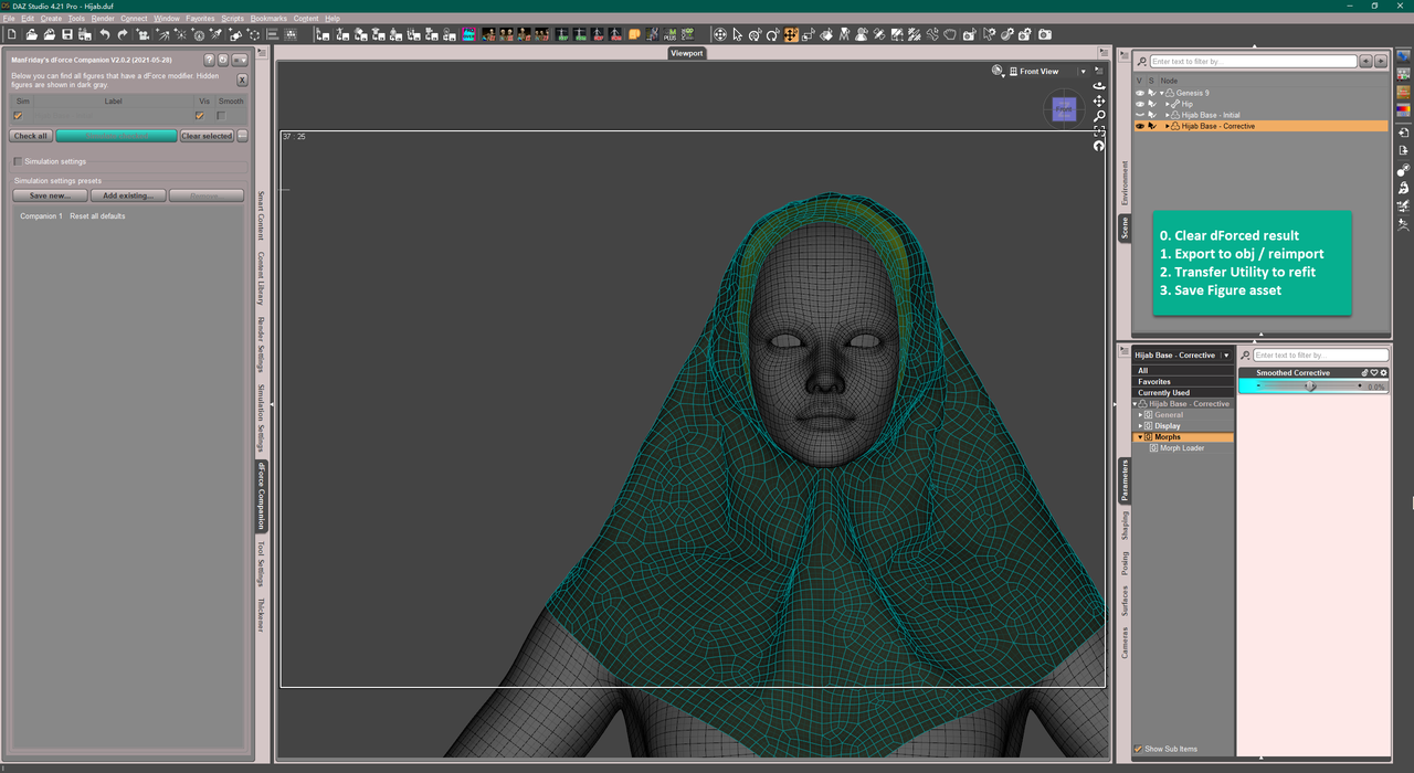 If you'd like to use the 'dForced result' as the base geometry of the hijab, you simulate it first and then export it as obj and import it back to DS. Then use Transfer Utility to make it 'refitted' to the figure, and save as Figure asset, as shown in screenshot 3 - 4.