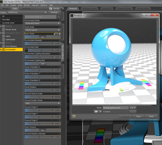 First image is the material ball with the environment that DS4.8 loads with and the sky draw OFF. The second is the same thing, but with the dome ON. See the fuzzy color splotches in the sky? That's the HDRI environment picture being projected as a sky.