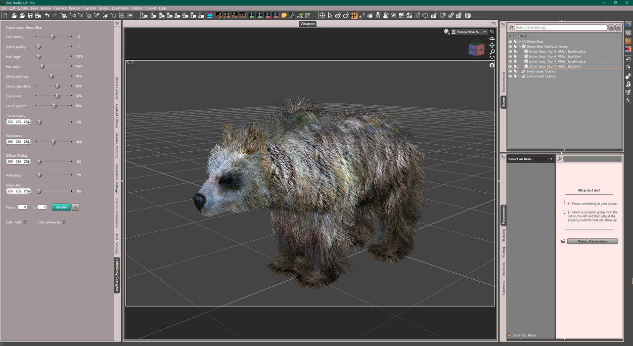 Second, I'm having a lot of trouble getting the fur to render properly. Initially I couldn't get the fur to render at all and thought it was a conflict with Iray, so I bought the Iray Catalyzer add-on, figured out how to enable it by registering the serial number, and then it rendered the fur... but the fur was an odd shade of blue.