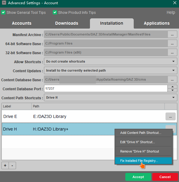 So I've double-checked in DIM for files that DAZ won't show offline with files that DAZ can see and they are all in the same directory. I've also checked the Content Database within DAZ and that is also pointing to the same place.