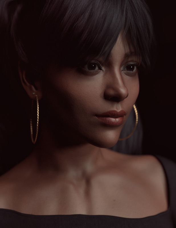 ^ Default HD load, swapped out eyebrows (HM Bellah's) and eyelashes (JS Tricia's). I like the twist bun hair a lot, but the scalp is too course for close ups, even with the fine settings selected. The Genesis 9 eyebrows always seem (to me) that they load too low down in the eye socket and I don't know if there is a way to easily tweak that? I'd say her materials are pretty standard quality for a Gen 9 Daz original.