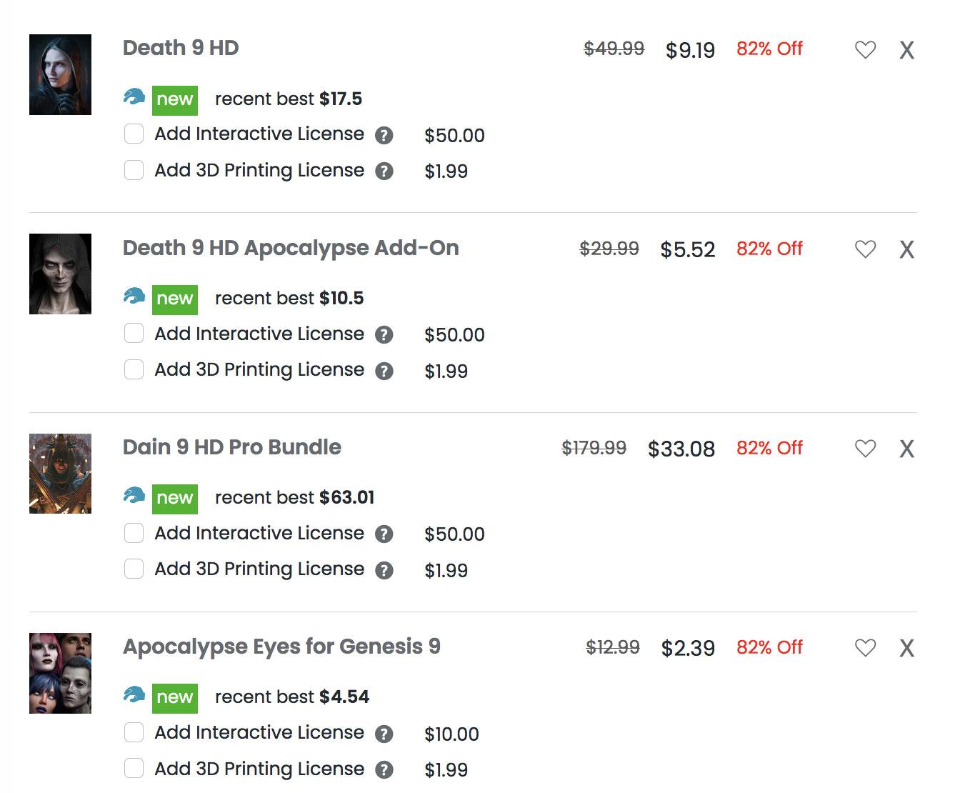 The discount from Dain Pro bundle is 50% off because you bought a new item, not because it was in the Genesis 9 bundles for buying Death. If you get one of those, they end up at 90% without tokens. Sadly the selection is very small and the 1/2 page is filled with mostly Victoria and Michael bundles. And debut new or recently new give you an EXTRA 50% OFF* any Non-new Release. Still, nice set of items you got at 82% Off. :)