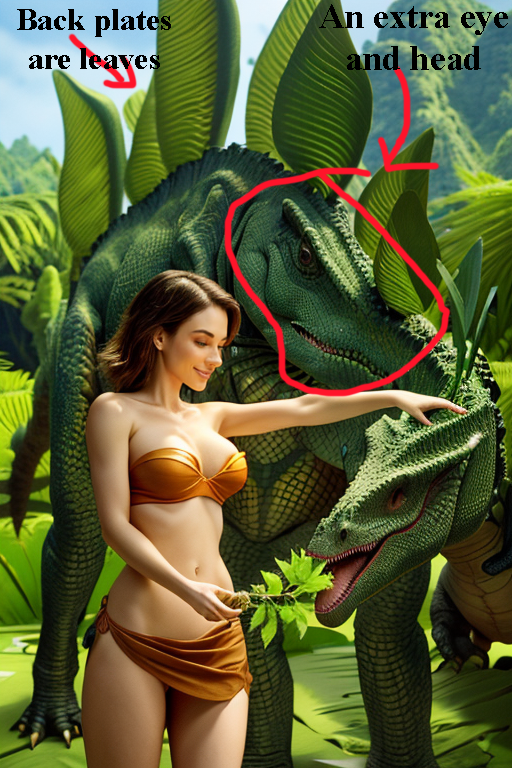 The first round of output produced images like this one. Some good elements to be sure, but the stegasaurus is problematic. The back plates are leaves. There is an extra head in the torso with an extra eye where the 'golden rule' lines cross for the upper thirds, and there is an extra stegasaurus body in the lower right.