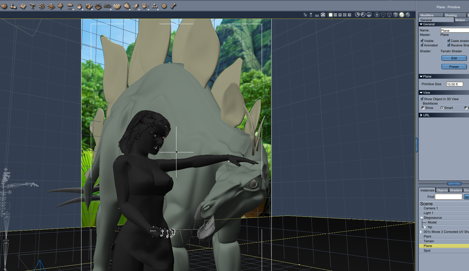 Good news, this is why I chose this project - to show that by having the original simple Carrara scene, shadow catchers can be used to help things along. I took one of the original problematic outputs and loaded it as a backdrop in Carrara's original scene, but turned the shaders for everything but the stegasaurus model to shadow catchers.