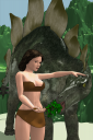 I started with this simple scene - my custom Moxie figure wearing cave girl clothes, a freebie stegasaurus, one Carrara plant, and one Carrara terrain.