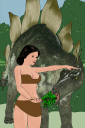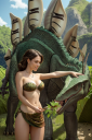Woman feeding stegasaurus. Idea was to have a woman standing with the critter approaching from behind and extending it neck in a sweep from the side to eat some leaves she is holding. Bad news, the AI very much wanted the eye of the stegasaurus in a specific position (upper right crossing of the horizontal and vertical 'thirds' lines). Good news, I can load the initial output back in Carrara with shadow catchers and put the eye back where it belongs. Bad news, not only does the AI want to put the eye back, it wants the back plates of the stegasaurus to be leaves - or extra heads like a hydra.