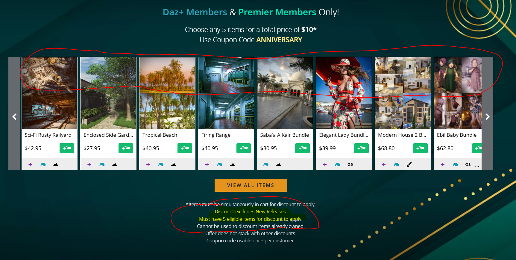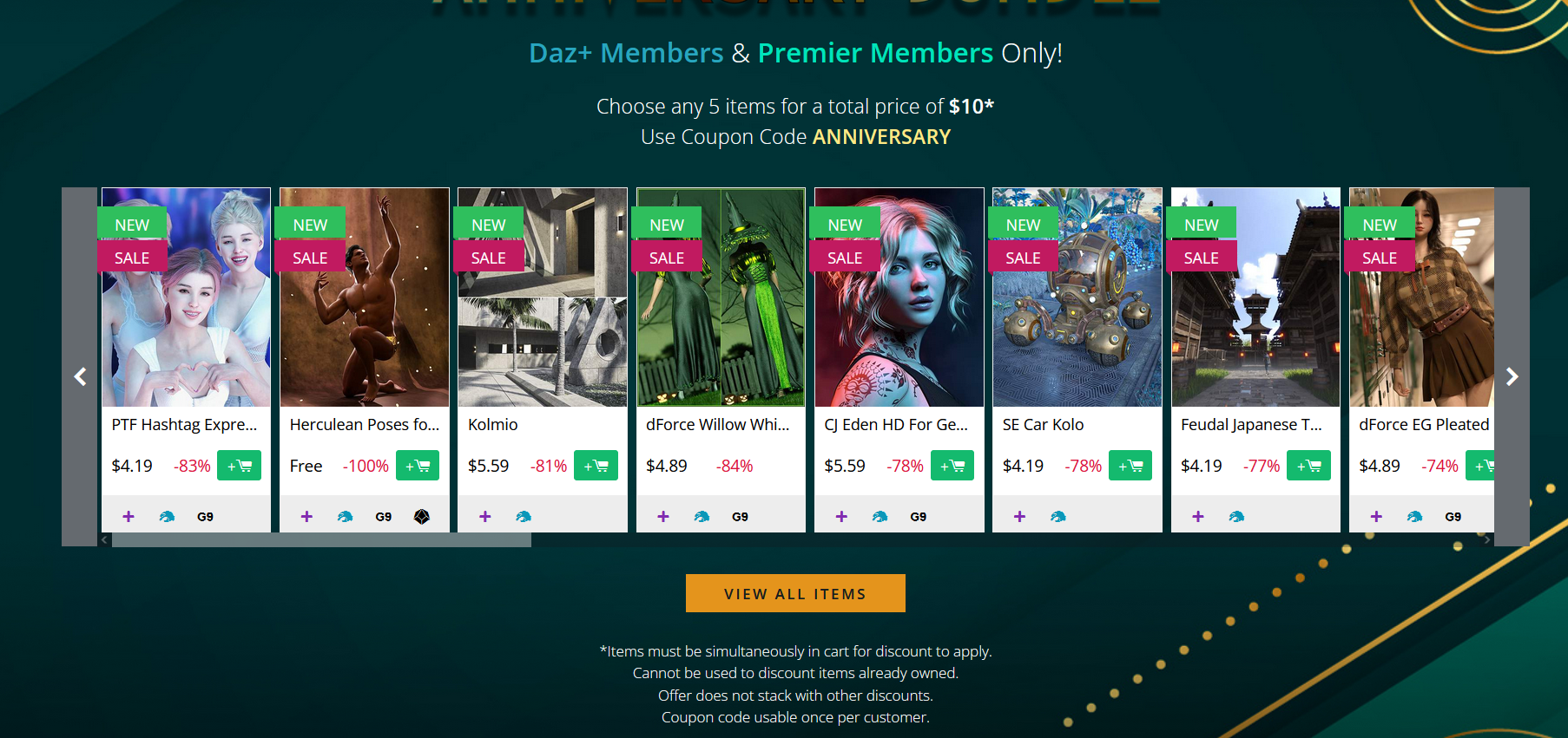 The ANNIVERSARY list also contains many products that cost just $0.81 individually for Daz+ or Premier members, which works out at $4.05 for 5 items and would be ‘a little’ overpriced at $10... ;-) Ancient stuff, but listed as ‘newest’, so appearing first in my list...