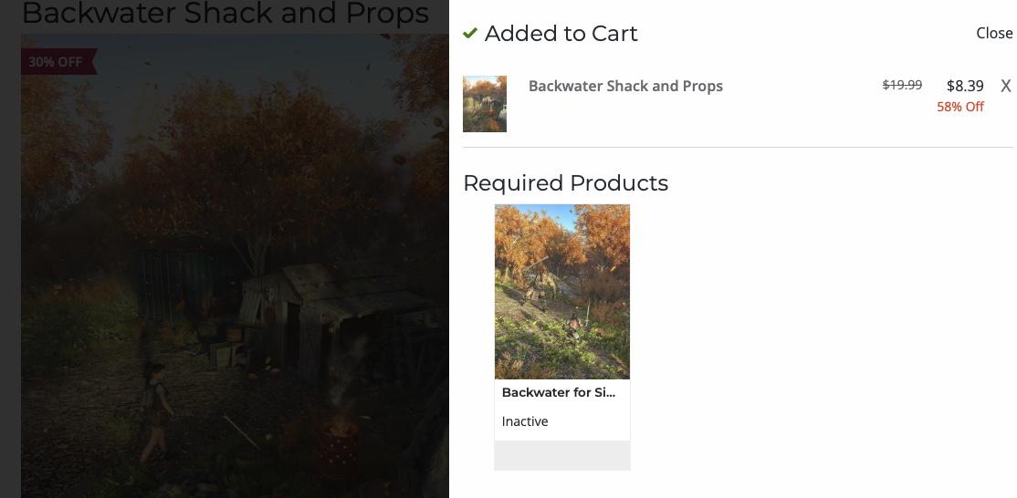 When I added Backwater Shack and Props to the cart, an inactive required product was listed at the bottom of the cart panel coming from the right of the browser window: