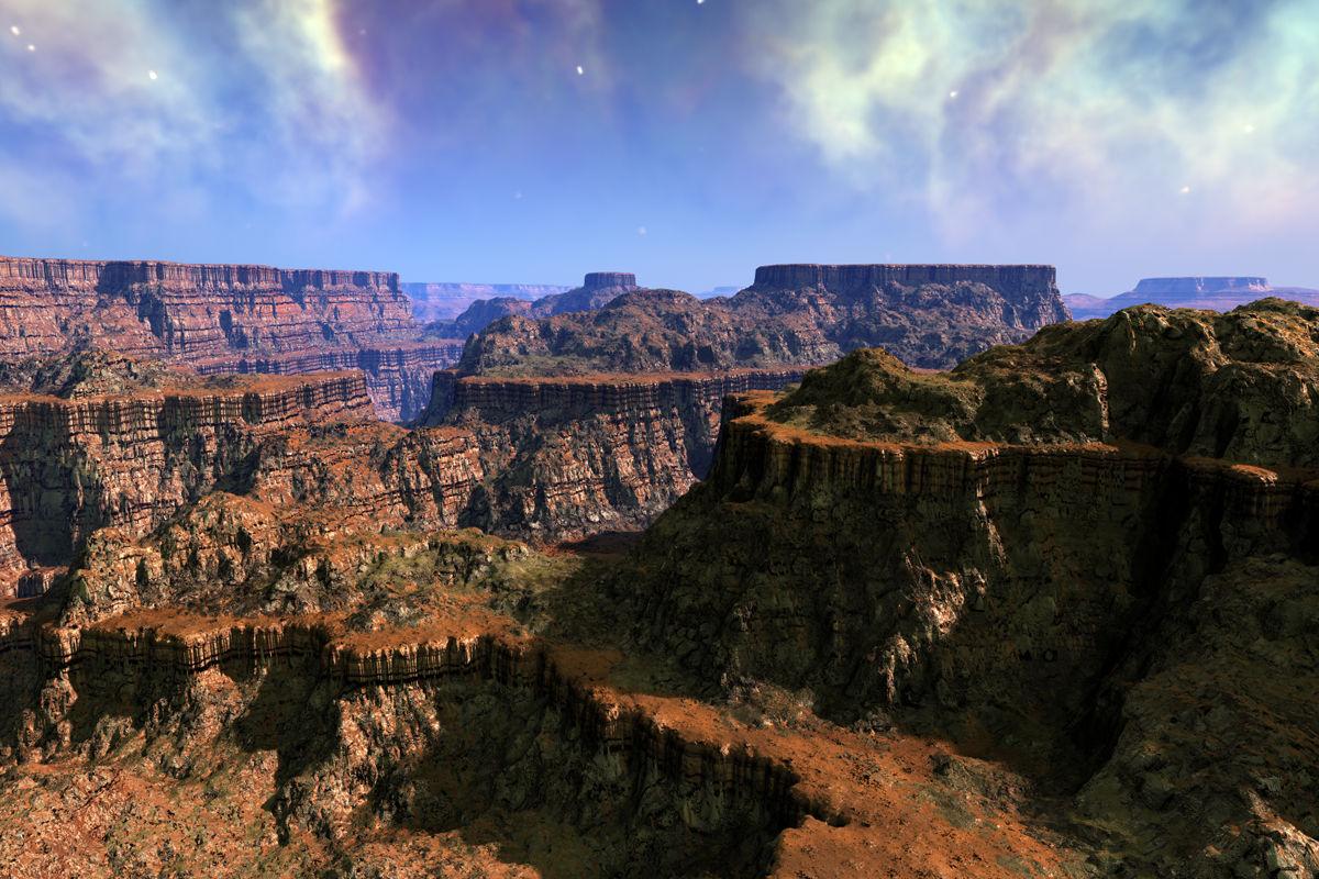 Double stacked terrain from High Resolution Terrains 1 with materials from the same set and High Resolution Terrains 2. Sky and ambient light by an HDRI from the Deep Space HDRI 2 set and the key light by the sun. A mesa on an alien world.