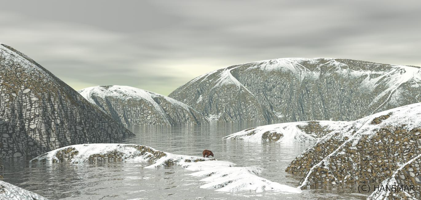 I made a second render with the same terrain, but now inverted. Textures (from Horo and David B) and sky different modified and I added a bear, posed in DAZ Studio. I call if 'fishing lake'.