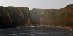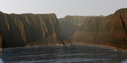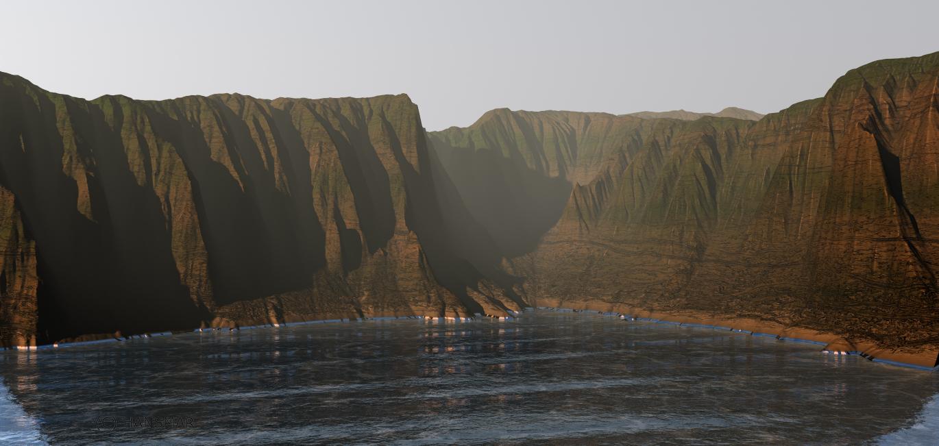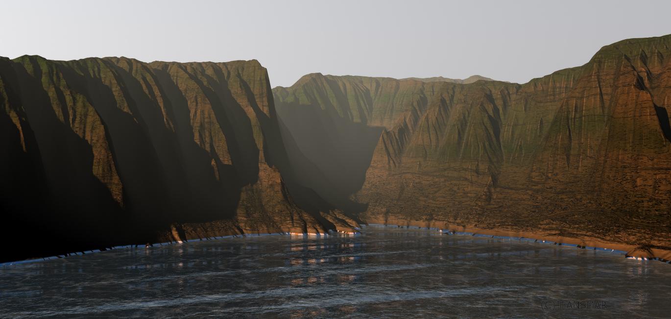 Both near terrains are from Golden Lighting and the far one from High Resolution Terrains 2, the material for all three terrains as well. The water is the ground plane with my own material. Sky and light by the SunSet HDRI from HDRI Enhanced Skies.