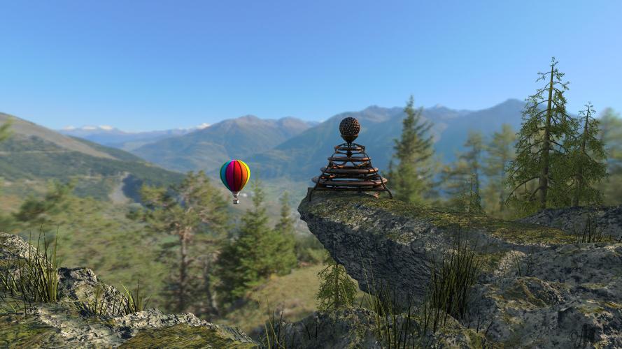 Double stacked self made terrain with materials from High Resolution Terrains 2 & 3 & 4. The balloon is the Hot Air Balloon. The clouds are from the CloudSphere6 and the ambient light by the belonging SkySC6 HDRI from the Sky Toolbox and the key light by the sun. Flight along the dividing ridge.
