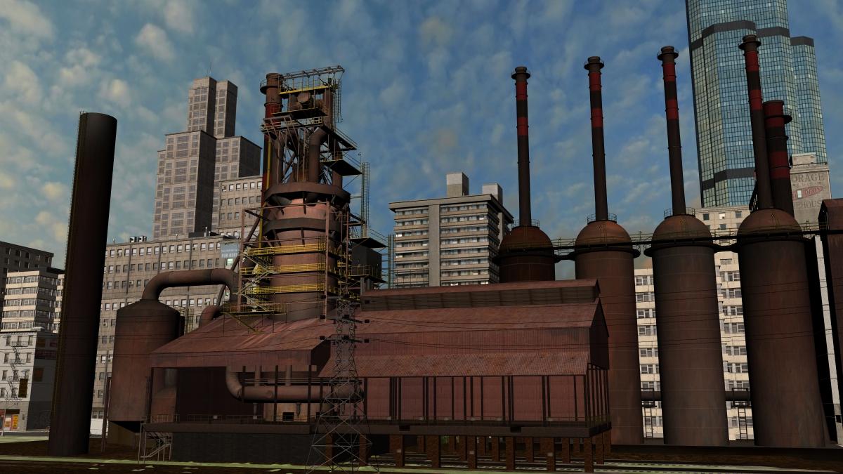 This is another set I really like for gritty industrial scenes. Fast rendering in 3DL. I used Urban Sprawl 2 as a backdrop and Worldbase Lushlands for the skies and sunlight. I repositioned Urban Sprawl to move it away from the blast furnace and put it in an attractive position. The steel furnace doesn't have the light or materials presets that the refinery has, but it has lots of camera presets. It also has the power lines as a prop so you can use it in other scenes as well.