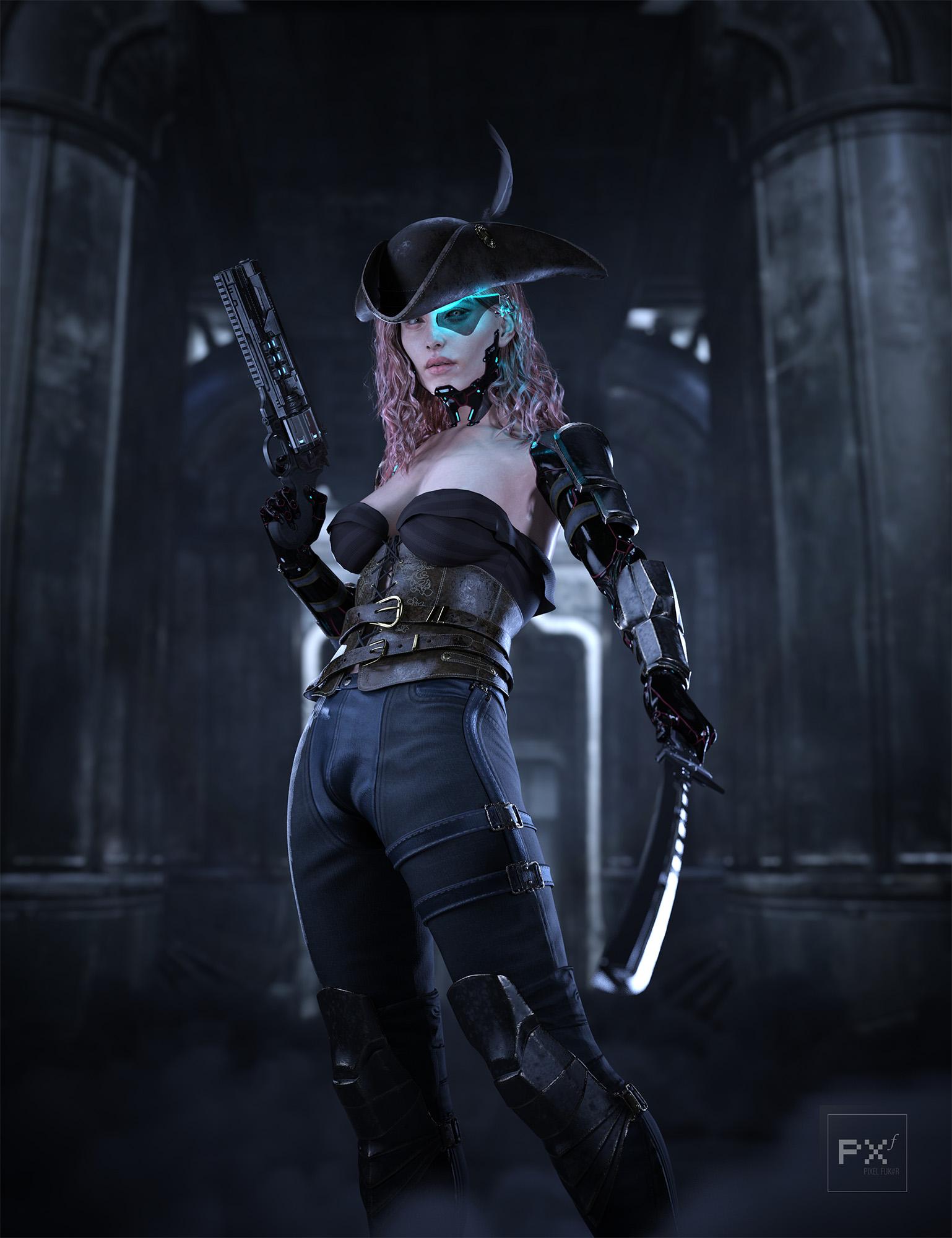 PAID ITEMS: dForce Wet Messy Bang Hair for Genesis 9, dForce Stellar Cowgirl Outfit for Genesis 9 (Boots, Pants & Arm Armor), Cyberpunk Revolver, Cyber Augments HD for Genesis 9, LI KineticArcana – Ground FX.