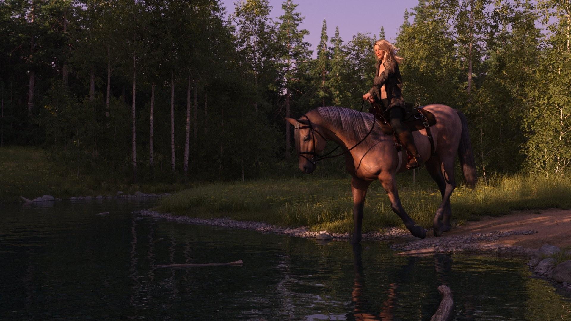 I got DAZ Horse 2 earlier this year and this is only the second time I've used it, and from the outlet store a few days ago I got the Western Saddle. I also wanted to test out the dry version of Linday's wet & dry G8F shirt which I got a while back, and I needed to test a recent purchase of one of Akhelloos' hairs. The only place to test everything was in a Pacific Northwest or Desert scenery, and as I feel happier in the woods, woods it was. I should possibly have swapped the arm poses, as the character's left arm is hiding most of her bandeau top under the open shirt, and despite the looks in this view, she isn't flashing.