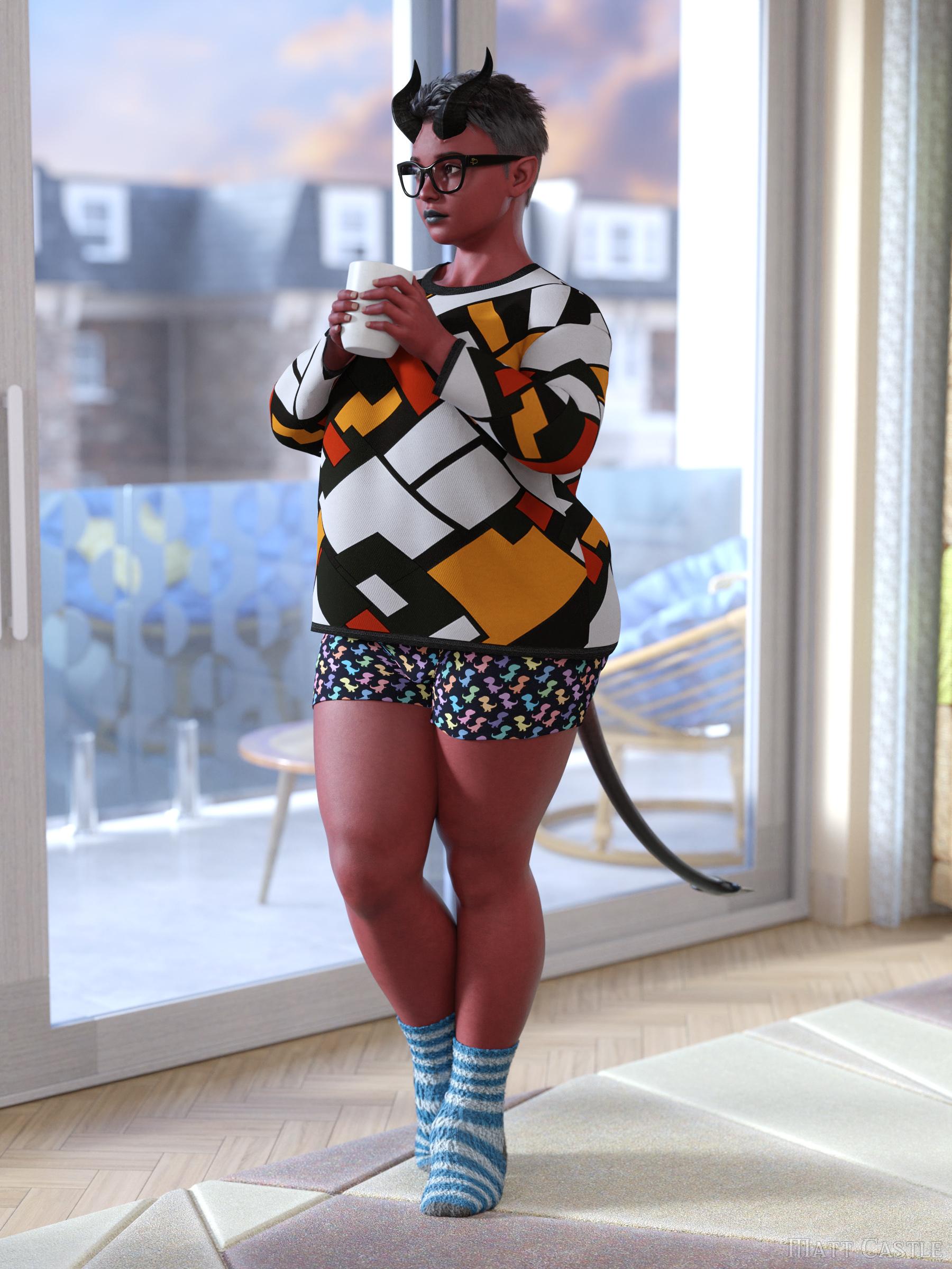I'm only now seeing this, thanks for posting your results! That's really not good. Has the outfit been fixed in the meantime? - I do love what you did with it, though, it looks so cozy on that sweet little devil. Are the socks included with that nice fuzzy material? Anyways, really nice render, makes me want to grab a mug and join in.