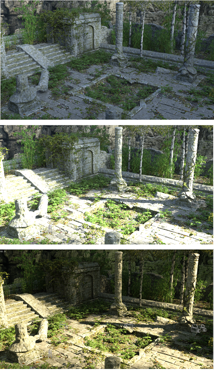 The first image is the abandoned temple out of the box. There are no render settings that come with it. Second is with the lights from Dreamlight's set. Third one adds the render settings from Dreamlight's set. Looks good! I have to work this environment into a setting where I've already got the lighting set up, so I have to see if I can use some of the light settings from this set to help it along.