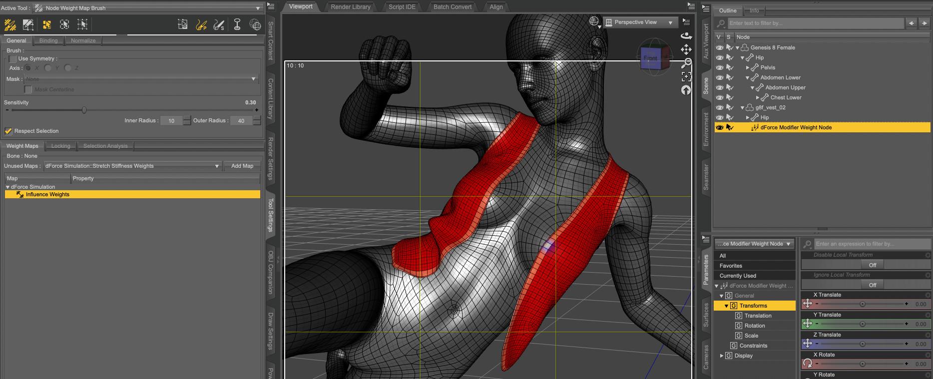 To prevent wardrobe malfunction in some poses where they should happen if it was not in a fantasy setting where the protective level offered by an armor worn by a woman is following an inverse square root law based on how little it's covering her body, it's possible, by adding a dForce Modifier Weight Node to the vest, to make the vest stick to the character's chest.