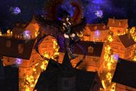 However, I had quite difficulties to render the scene: even after having reduced some maps, the scene was too cumbersome for my computer, so I had to render separately the sky background, the village with fire, and the Dark Ascendent with the maginc ribbons. Then, I renconstructed the final images with GIMP.