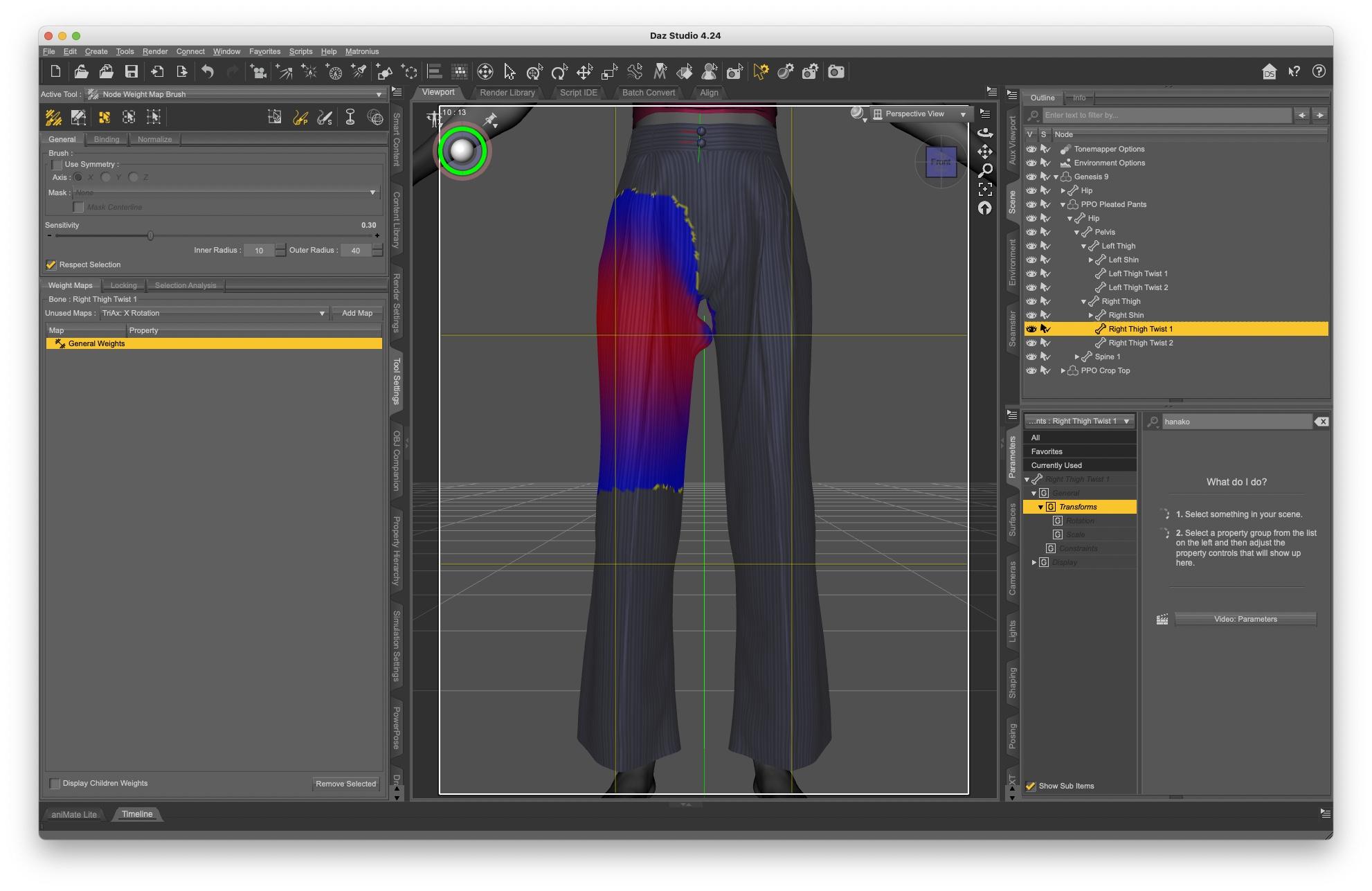 1) With Node Weight Brush, select the bone: Left Thigh Twist 1, then Shift + L, select the polygons that have wrong weight on right thigh. Then Fill Selected with 0 Weight from right-click menu. (screenshot 1). Fix the weight mapping on Left Thigh Twist 2, Right Thigh Twist 1 and Right Tight Twist 2 in the same way ~~