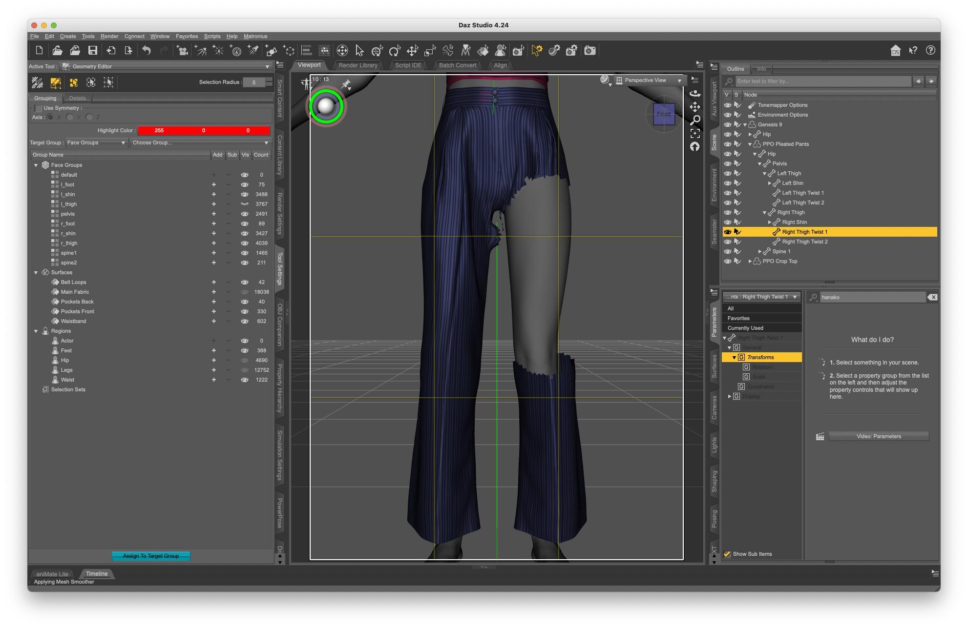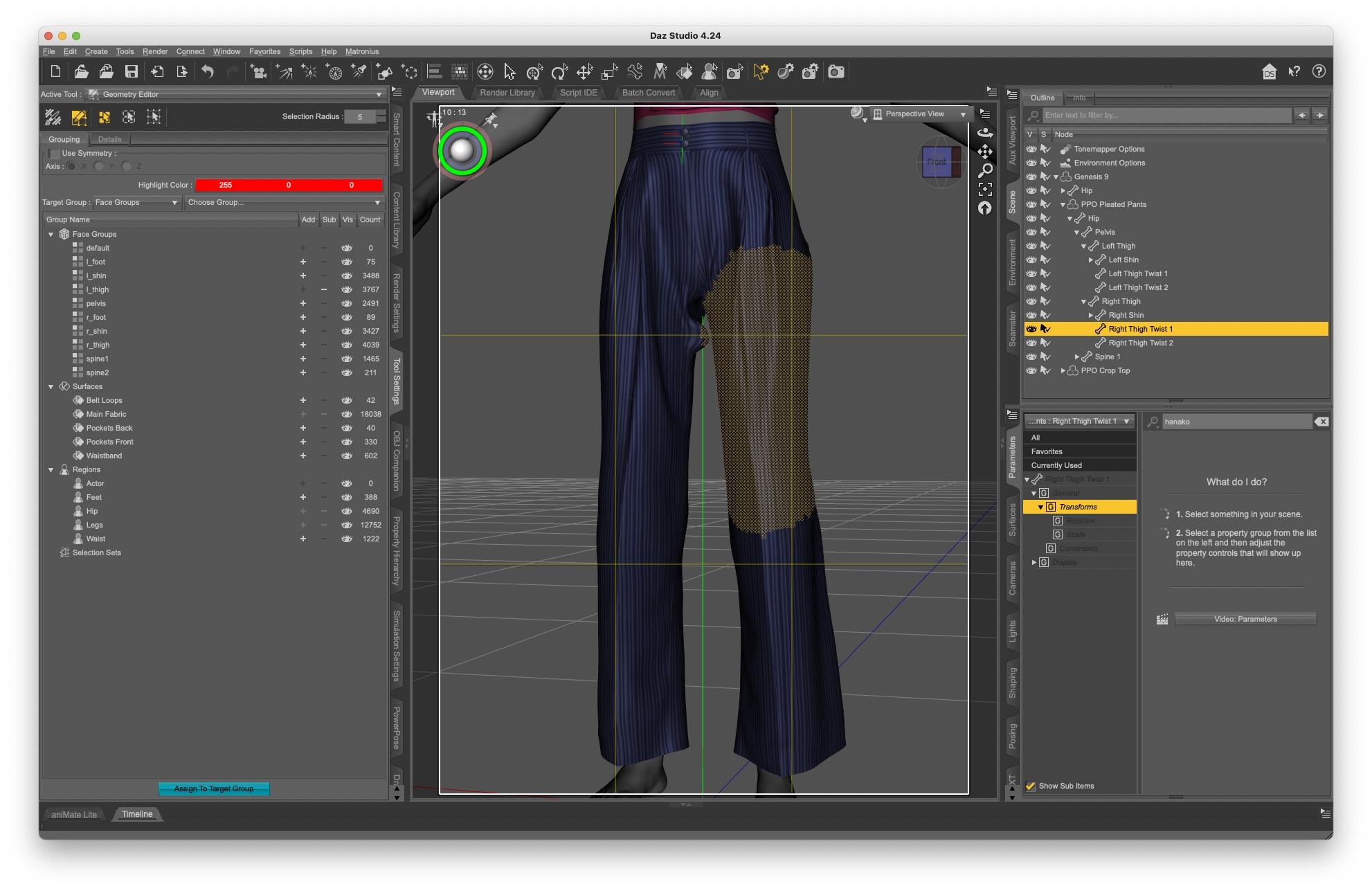 2) Fix the Base Mesh of inner thigh on the right side... with Blender or Mesh Grabber. Export / Import OBJ to Update Base Geometry of the pants via Edit > Figure > Geometry... (screenshot 2)