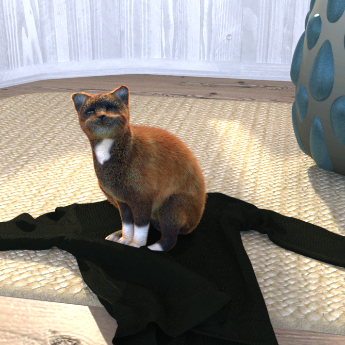 So I tried the expressions out on DAZ House Cat and built a scene. Imagine you are getting ready for a date, walk back into your bedroom to get dressed and the lovely OOT sweater you were going to wear is now on the floor with your best friend, the CAT having made it his/her new snuggle blanket. The grin and half-closed eyes express their love of you for buying them this great item.