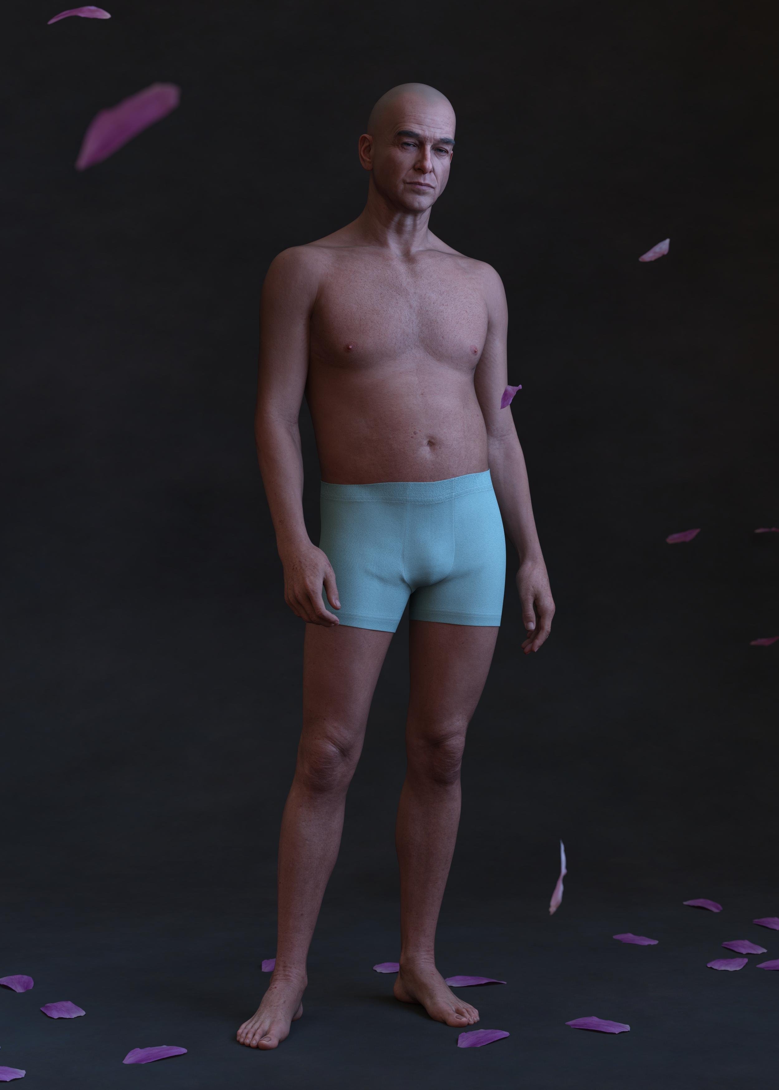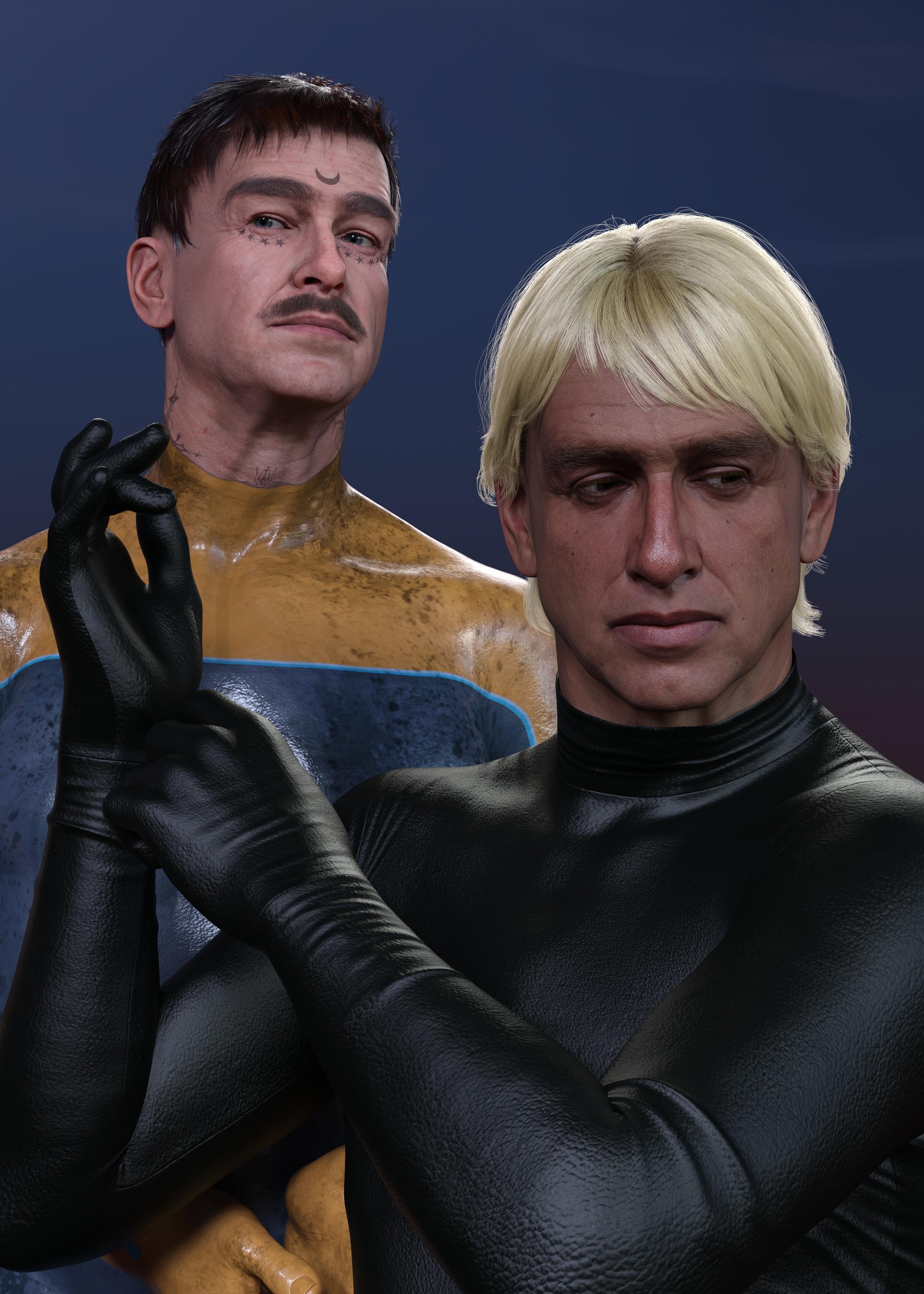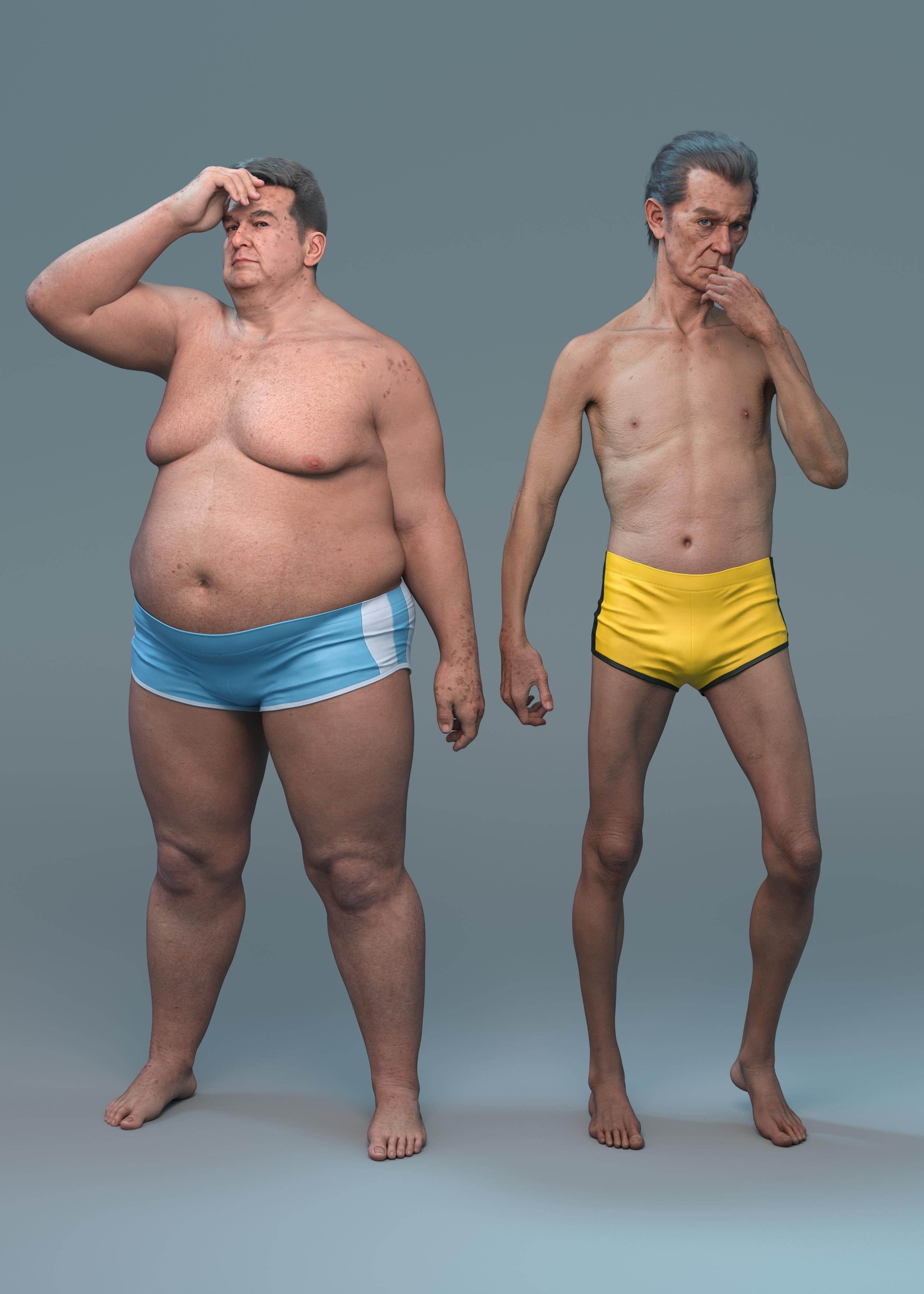 Eric for Everett next to Walter 9 HD. I've applied Walter's age spots to both. Walter here is wearing the hair that came with the bundle but I think that was a 3rd party omni shader I rendered it with. I doesn't appear to have any movement morphs, but the groom is nice enough.