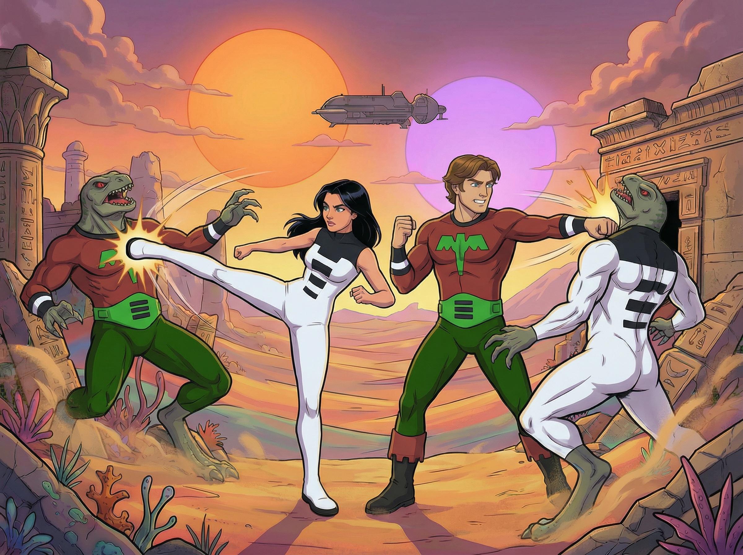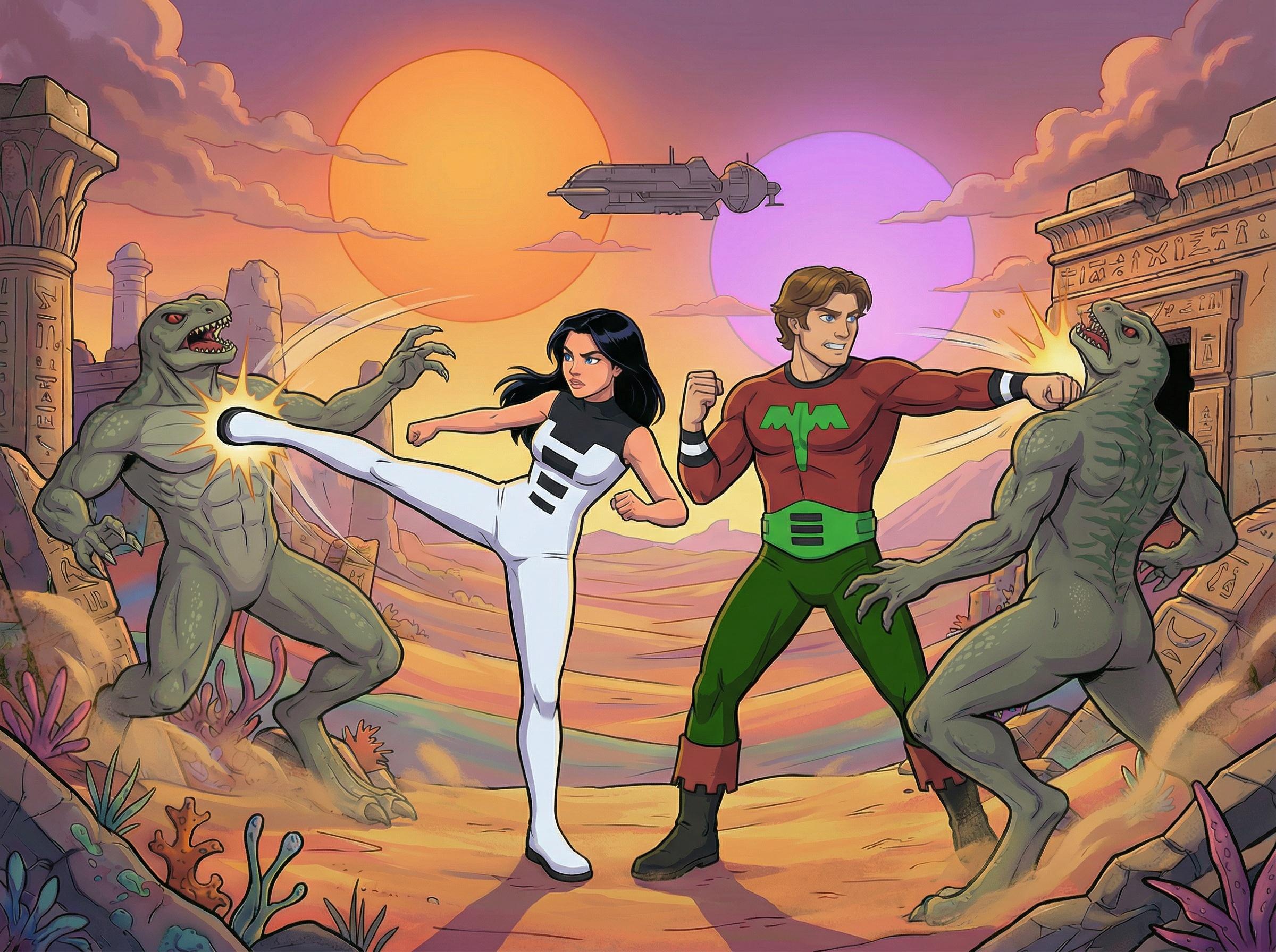 Then, I thought, they kinda look like two of my favourite DC superheroes from my younger days; luckily I own a mess of Mightmite's superhero assets, so I had them change to his Ultra Boy and his two Phantom Girl outfits:
