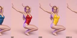 UNBM 2.0 looks a bit better to my untrained eyes, with one caveat: there is a 'UNBM Feminine Breasts' that will change the shape of the breasts of the character, which I dialed down to zero each time because I don't like what it is doing (at least in the base pose, maybe it's doing something else once a character is posed).