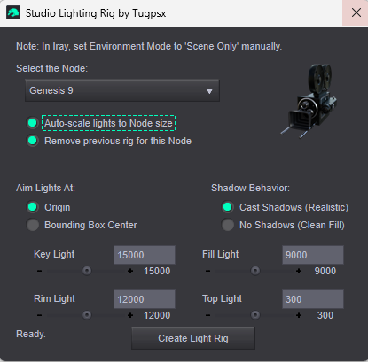 Actually I do have another project that creates a light rig for a selected character. I made it for a car render animation i was working on. It is not completed and the HDRI section is not showing in this version.