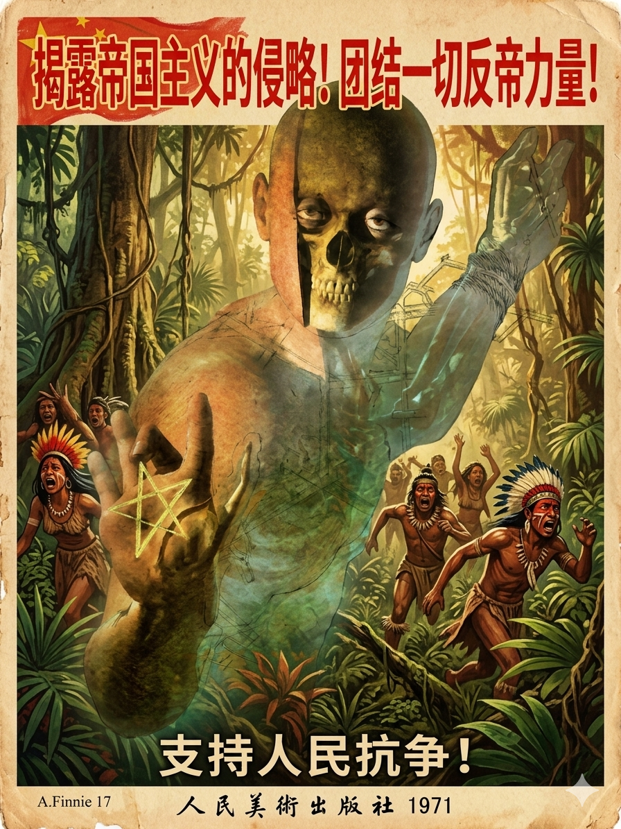 The imagery aligns with real Cultural Revolution–era posters that depicted imperialism as monstrous forces threatening oppressed peoples.