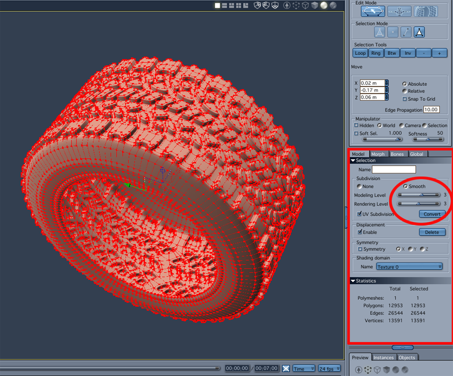 Yes, that smoothing is a rendertime effect - it actually increases the poly count at render. No problem if it's just the one tyre, but when you add to that three more, plus the car and everything else, it becomes significant. With something that well constructed, I doubt whether there will be that much apparent difference if you only did one level of smoothing.