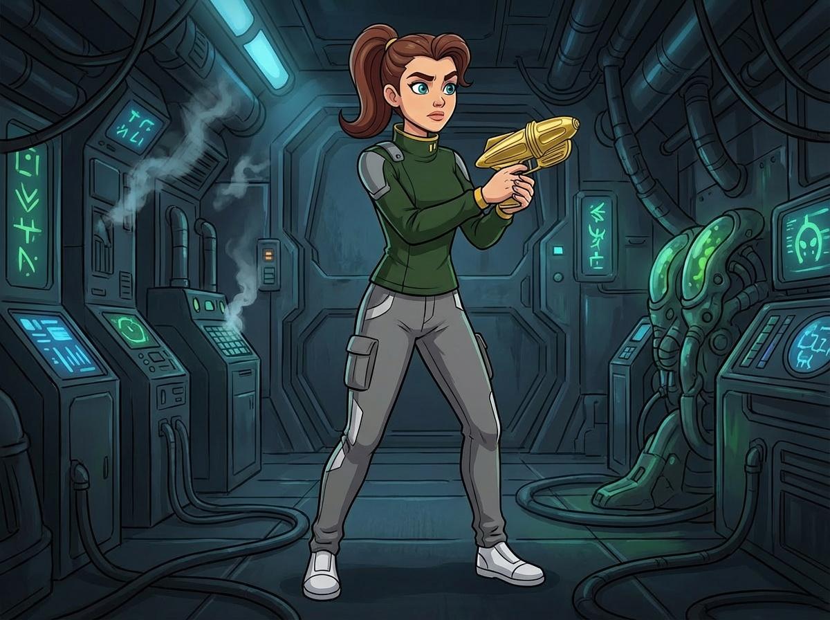I'm still experimenting, but this is what I got pretty much on my first try; here's my first two attempts at a 2D-style animation using her product on the character, clothing and starship bridge.