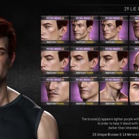 “FPE Face Bruises LIE and Morphs” for Genesis 9 is a pack of 15 unique bruises (and 14 mirror versions) to show your characters have survived despite difficult times.