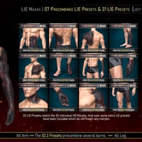 20 are provided to build your burn, with two different masks per placement to ensure a more natural look by avoiding symmetry. Ten masks for the pre-combined shaping presets and masks covering areas the HD Morphs do not cover are also included.