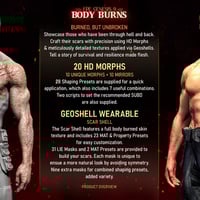 The Body Scar Shell features a realistic burned-skin texture that spans the entire body, accompanied by 23 MAT & Property Presets to help achieve a seamless blend with the underlying skin, regardless of color or texture.