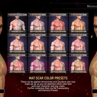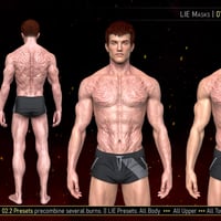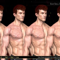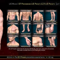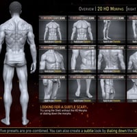 20 presets are provided to help you build your scars. Each mask is unique, providing a more natural look by avoiding symmetry. 10 extra masks for the pre-combined shaping presets and masks covering areas the HD Morphs do not cover are also included.