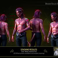 Use the elements in this pack to transform your characters into a mythical half-dragon. Populate your world by using the scales in different shades and places so that no two characters look alike. Mix and match with the products already in your runtime for endless possibilities.