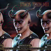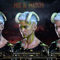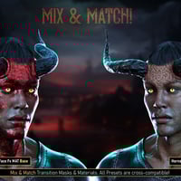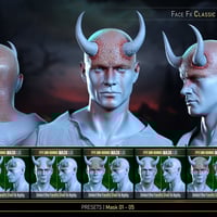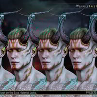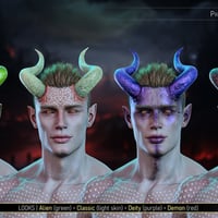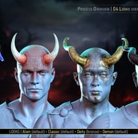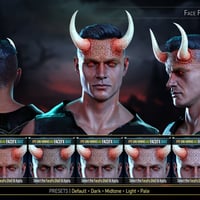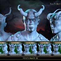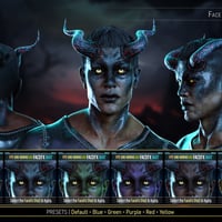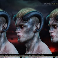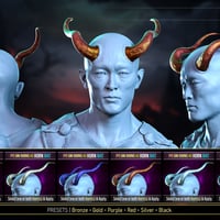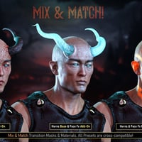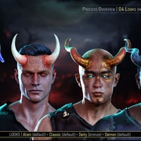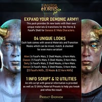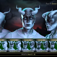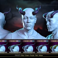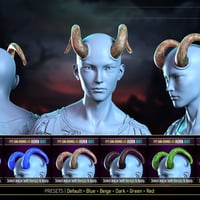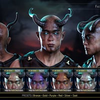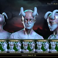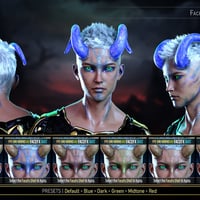 The product has four unique looks: Alien, Classic, Deity, and Demon. They all come with their own set of Material Presets (5-6 each), Transition Masks for the FaceFx Shell (5 each), and Horn Textures (5-6 each). In total, you get 23 FaceFx Material Presets, 25 Transition Masks Partial Material Presets, and 22 Horn Material Presets.