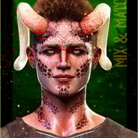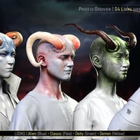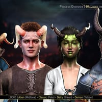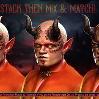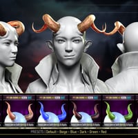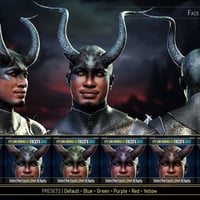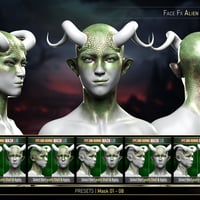The product has four unique looks: Alien, Classic, Deity, and Demon. They all come with their own set of Material Presets (5-7 each), Transition Masks for the FaceFx Shell (5 each), and Horn Textures (5-6 each). You get 23 FaceFx Material Presets, 25 Transition Masks Partial Material Presets, and 22 Horn Material Presets.