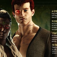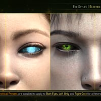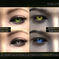 This pack comprises 72 Eye Iray Hierarchical Material Presets, 1 Wearable Presets, 13 LIE Face Effect Presets, 15 Utility Options & 2 Property Presets.