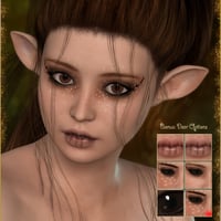 The head and body are uniquely custom sculpted in Zbrush, and the skin was created using high quality photo references for depth and detail. She also comes with custom sculpted navel that will apply when the navel dial is applied, and a nail morph. Furthermore there are two sets of Ears, for a Christmas Elf and a Deer character! The Body and Head come in an HD version as well, that can be applied and removed manually.