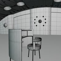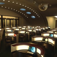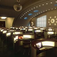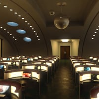 This retro sci-fi scene is perfect for those who fantasize about space travel...a blend of the 1950s depiction of how space travel and agencies look like but with the tech of our modern times; from the glass block, the metal and wood furniture, and the Old hangar transformed into a training facility for the Galactic explorers.