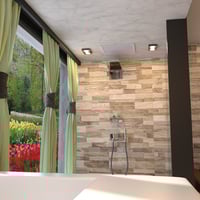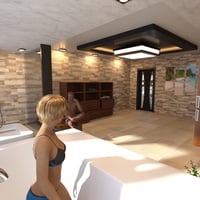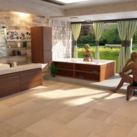 A 3D model of a Gardenview Bathroom. It has a nice large glass window that surely invites the beauty of a garden (garden not included). It has modern-type objects that compliment the elegance of the bathroom.