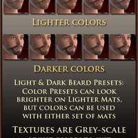 Richard Haseltine has created a great little script (our thanks to him) to apply and change only colors. You can tweak colors in the scripts (color strings are at the top of the script, just input RGB values) or in the surfaces under Diffusion Color. Darker going to lighter toward the surface layers of the beard help give more dimension where light would normally hit the outer hair most, but play with them to see what effects you get and test with both Light and Dark mats for more possibilities since they will affect the same color differently.What's Included and Features
