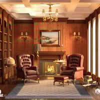 All the classic elements in the room from the leather wingback chairs and the wood paneling on the walls to the old books and arched windows, are all you need to get that cozy feel you want. While the small details like crystal glasses and spectacles are not overlooked.