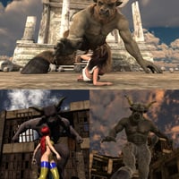 Sure the Minotaur is a large and imposing character, but what if he were truly gigantic? Giant Sized Minotaur provides you with some fun poses that will make a BIG difference in your fantasy renders. It includes 18 coordinated pose sets with the Minotaur as the “Giant” and either Michael 6 or Victoria 6 as the “Little People” in his life. All of the “Little People” poses are optimized for both Victoria 6 and Michael 6, so you can choose who gets to play in your scenes.