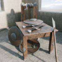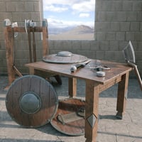 This Props pack comes with Broad Axe, Battle Axe, Gladiator's Axe, and Woodaxe, plus two historic short swords, sheath, shield, and a Table and Weapon Holder to display your newest collection of implements of war.